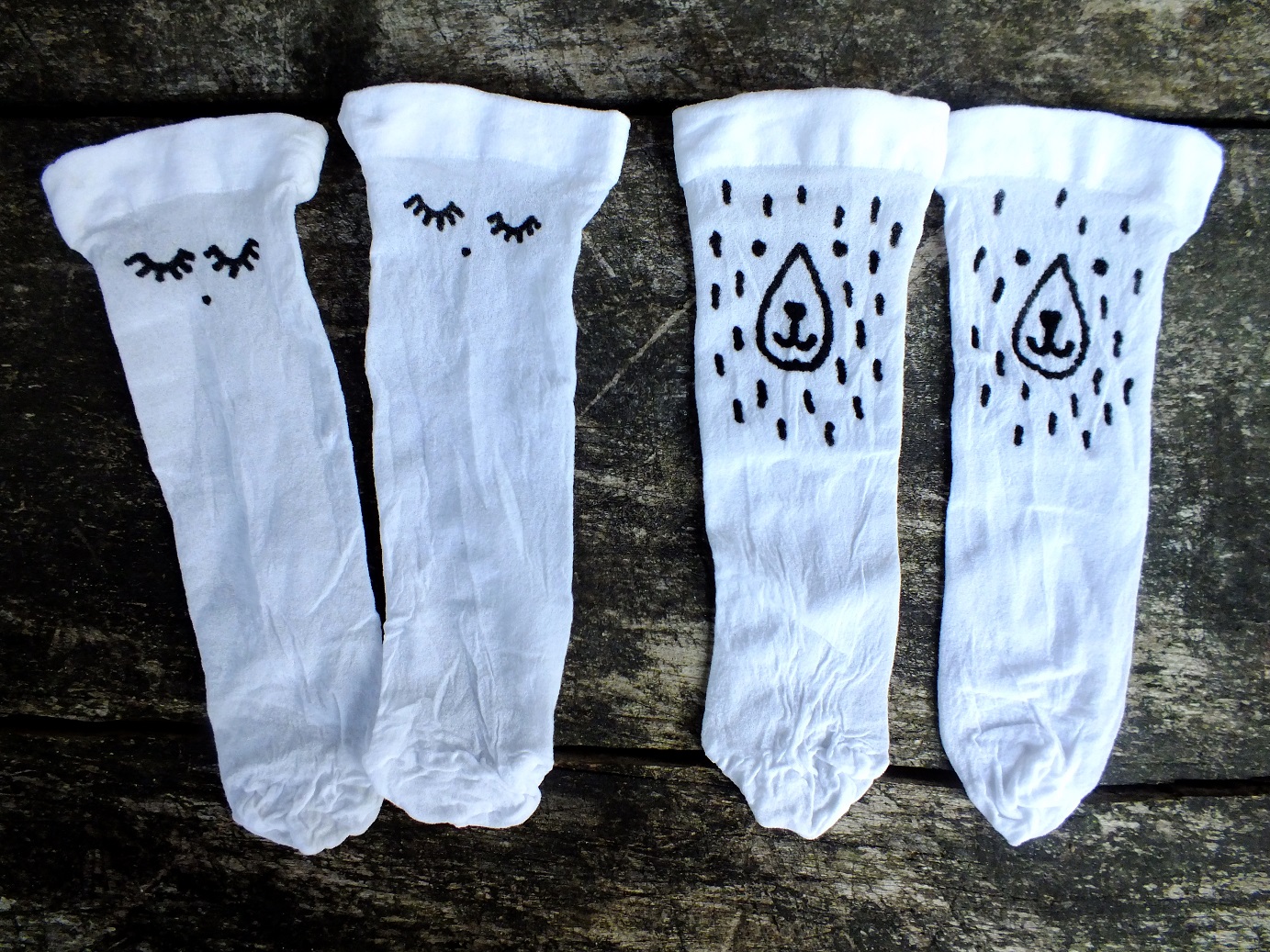 Podkolanówki to fajna i praktyczna część garderoby, jednak na tyle mało popularna (w wersji jednokolorowej), że w moim małym miasteczku wręcz nieosiągalna… Niczym Sherlock Holmes chodziłam od przybytku do przybytku i po zebraniu wszystkich dowodów, przesłuchując świadków w różnych sklepach z odzieżą dziecięcą, dotarłam wreszcie do rozwikłania zagadki pt. „Gdzie są moje podkolanówki?”. O jakimkolwiek wyborze mogłam tylko pomarzyć… znalazłam białe, bardzo cienkie. Nie, ja wcale nie narzekam, jako materiał do eksperymentów nadały się idealnie!