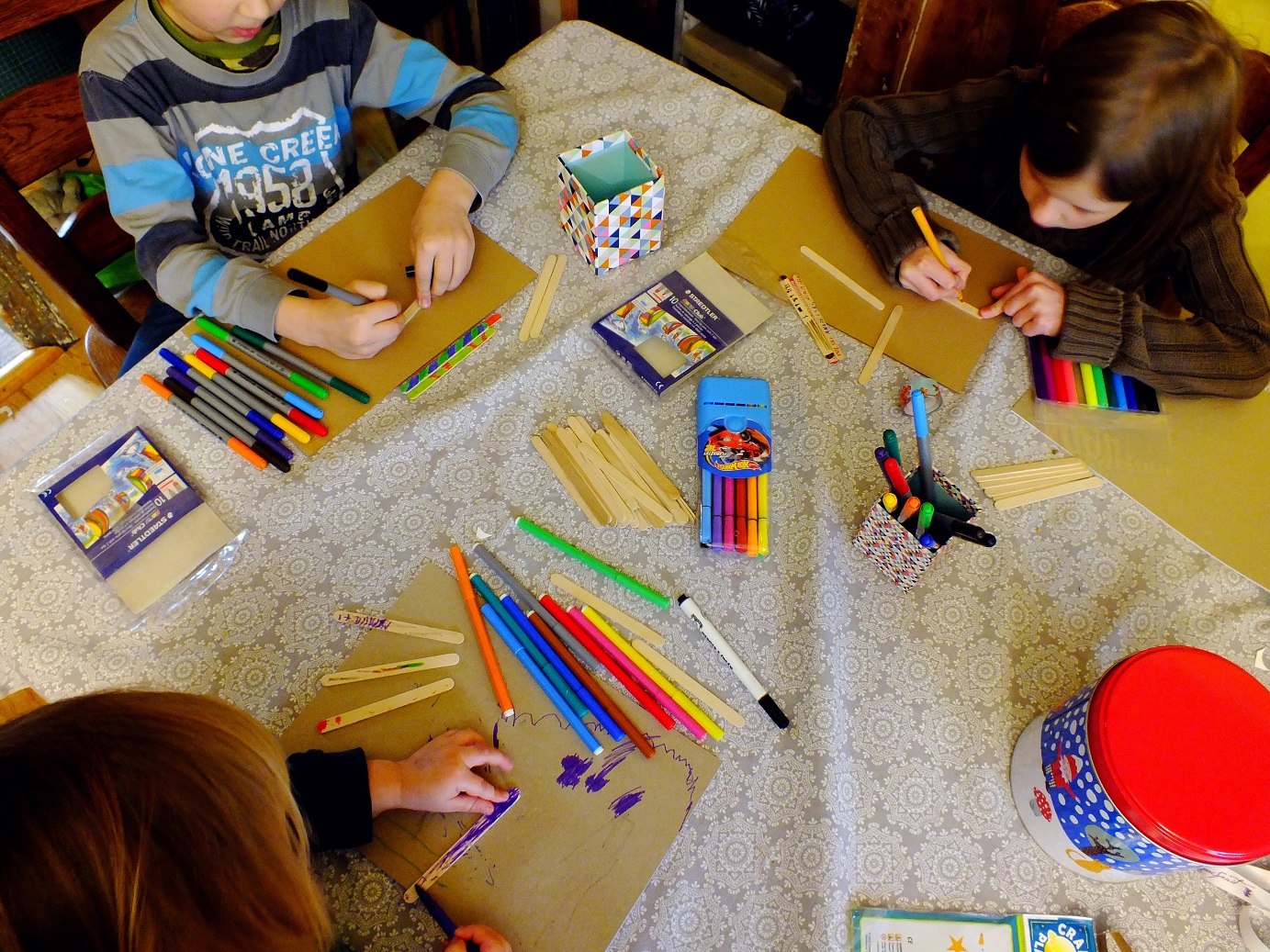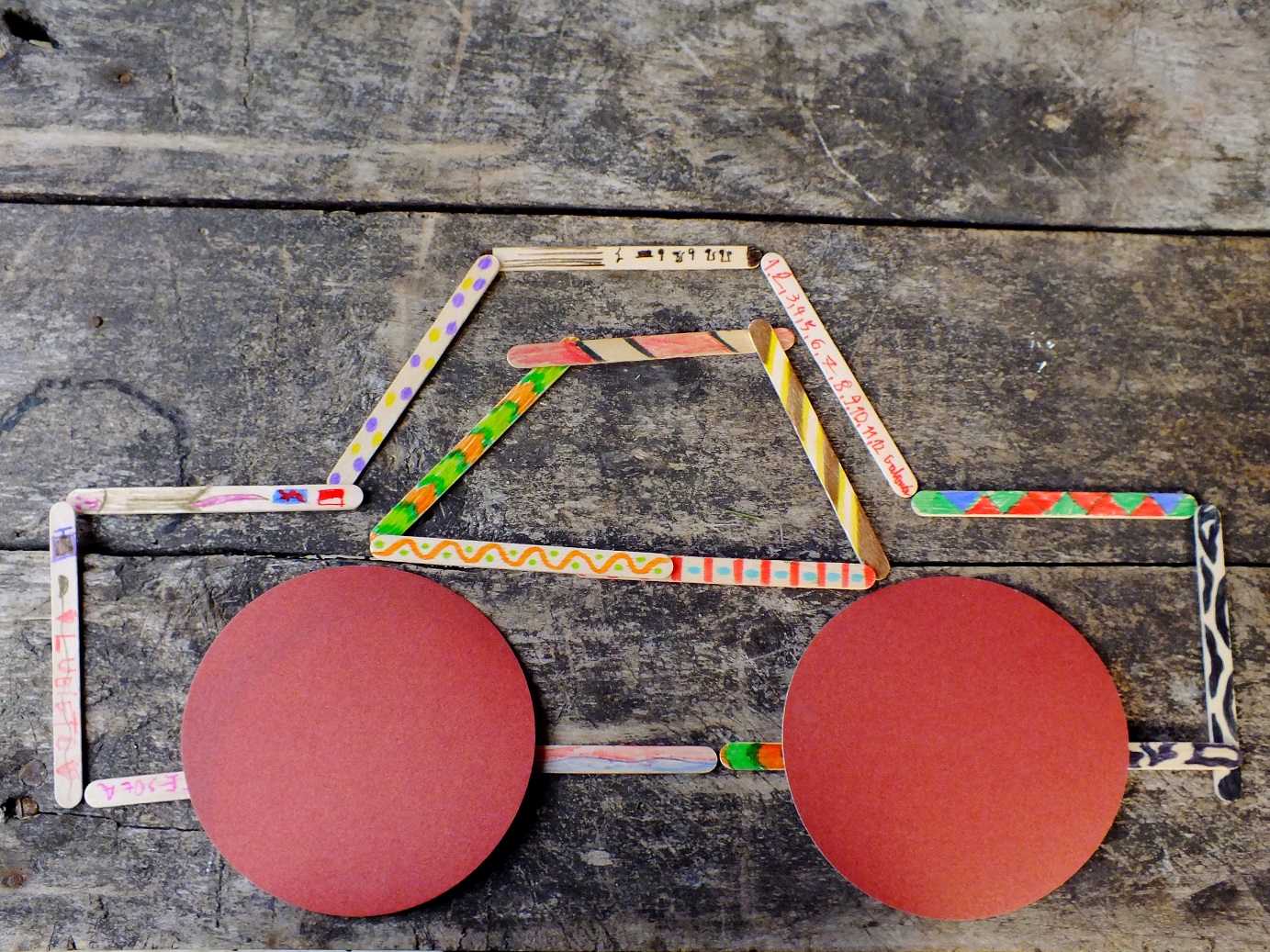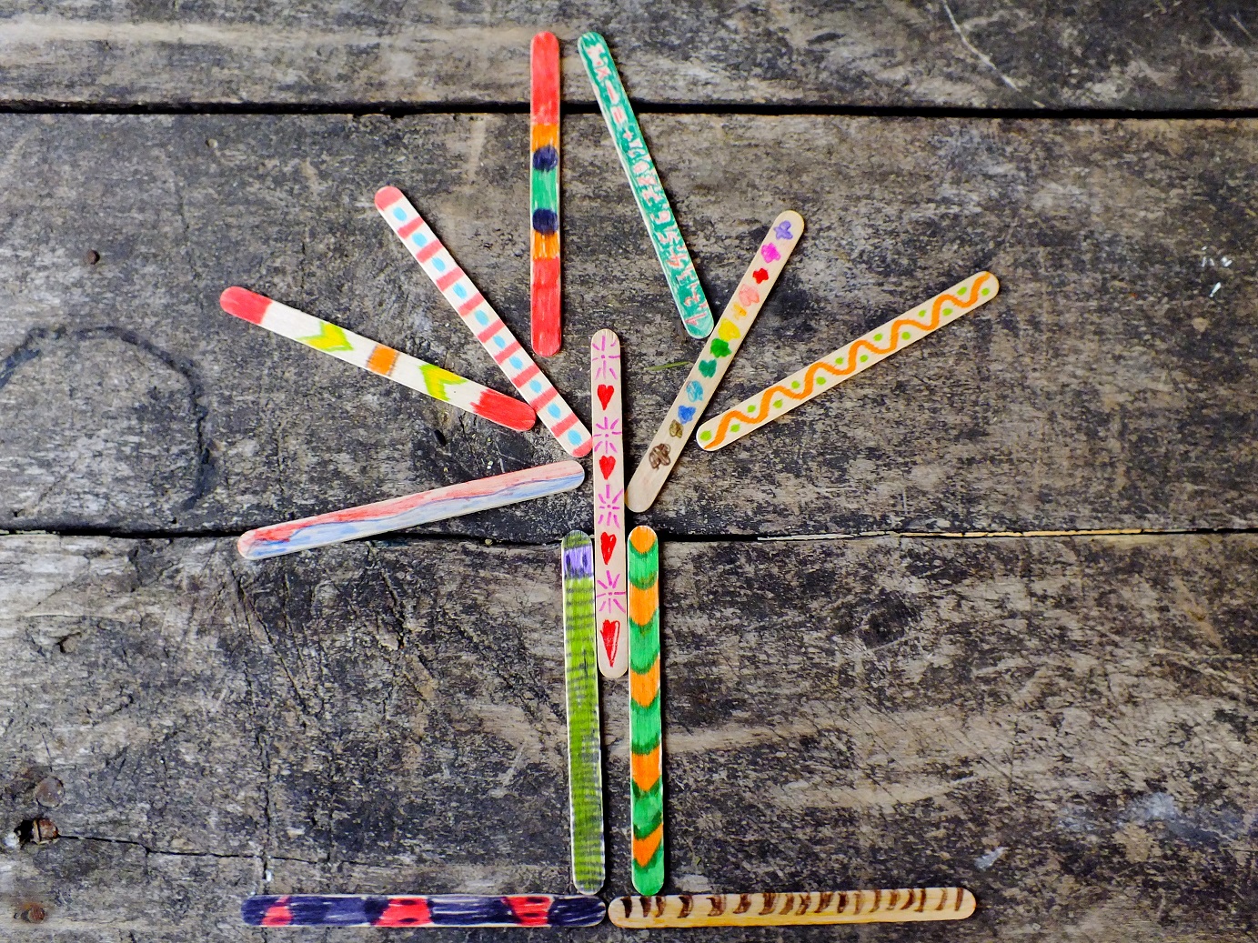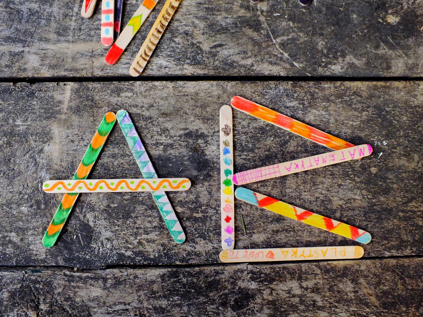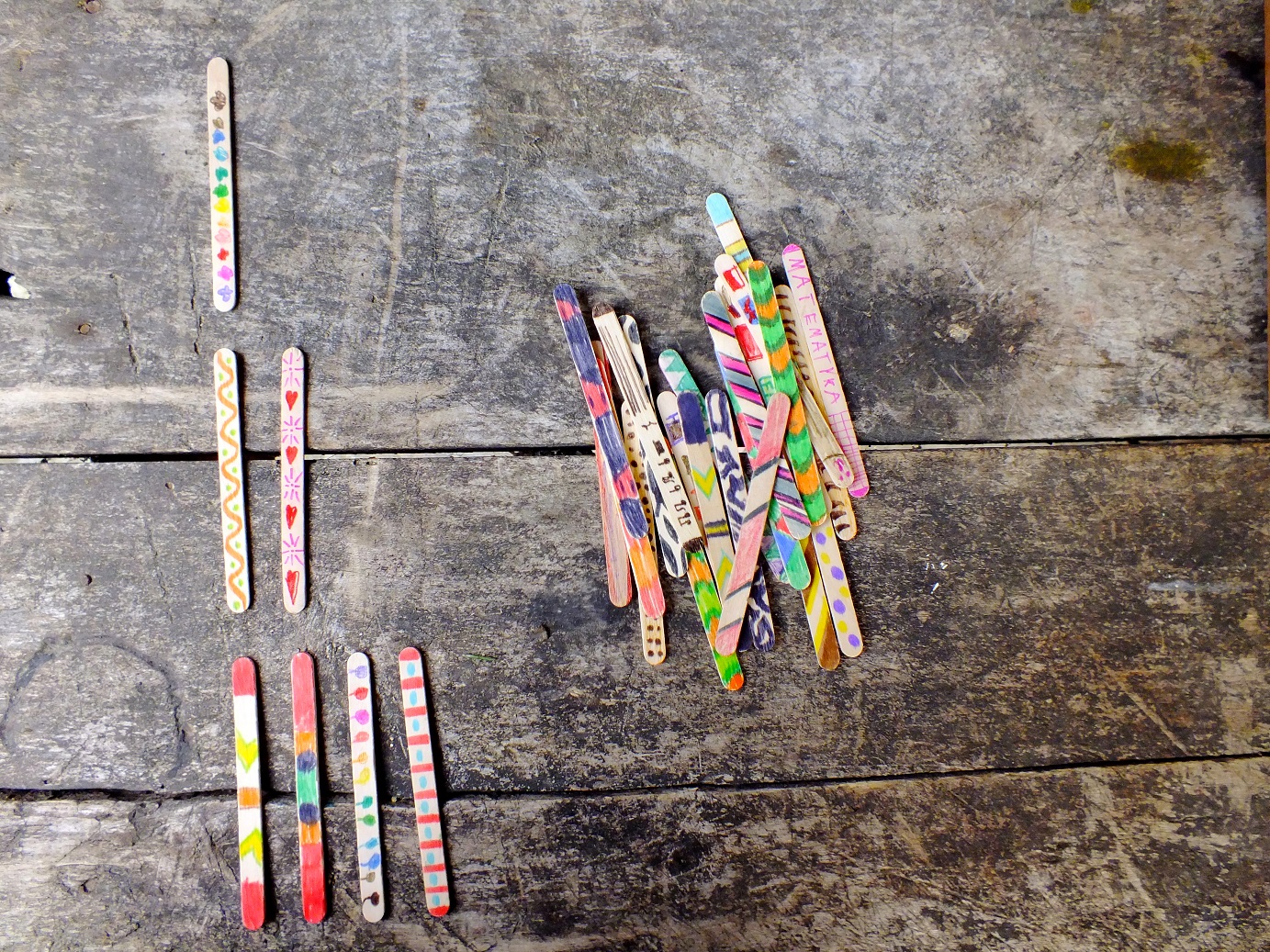 Można zrobić z nich przeróżne formy przestrzenne od mebelków dla lalek, aniołków, figurek, wiatraczków, choinek, ramek na zdjęcia, osłonek na doniczkę i wielu wielu innych… my mieliśmy dużo świetnej zabawy przy ich malowaniu, a później układaniu z nich obrazków! Ba nawet niezłe historyjki z tego układania wyszły… Patyczki doskonale nadają się także do nauki kolorów, liczenia czy poznawania literek.