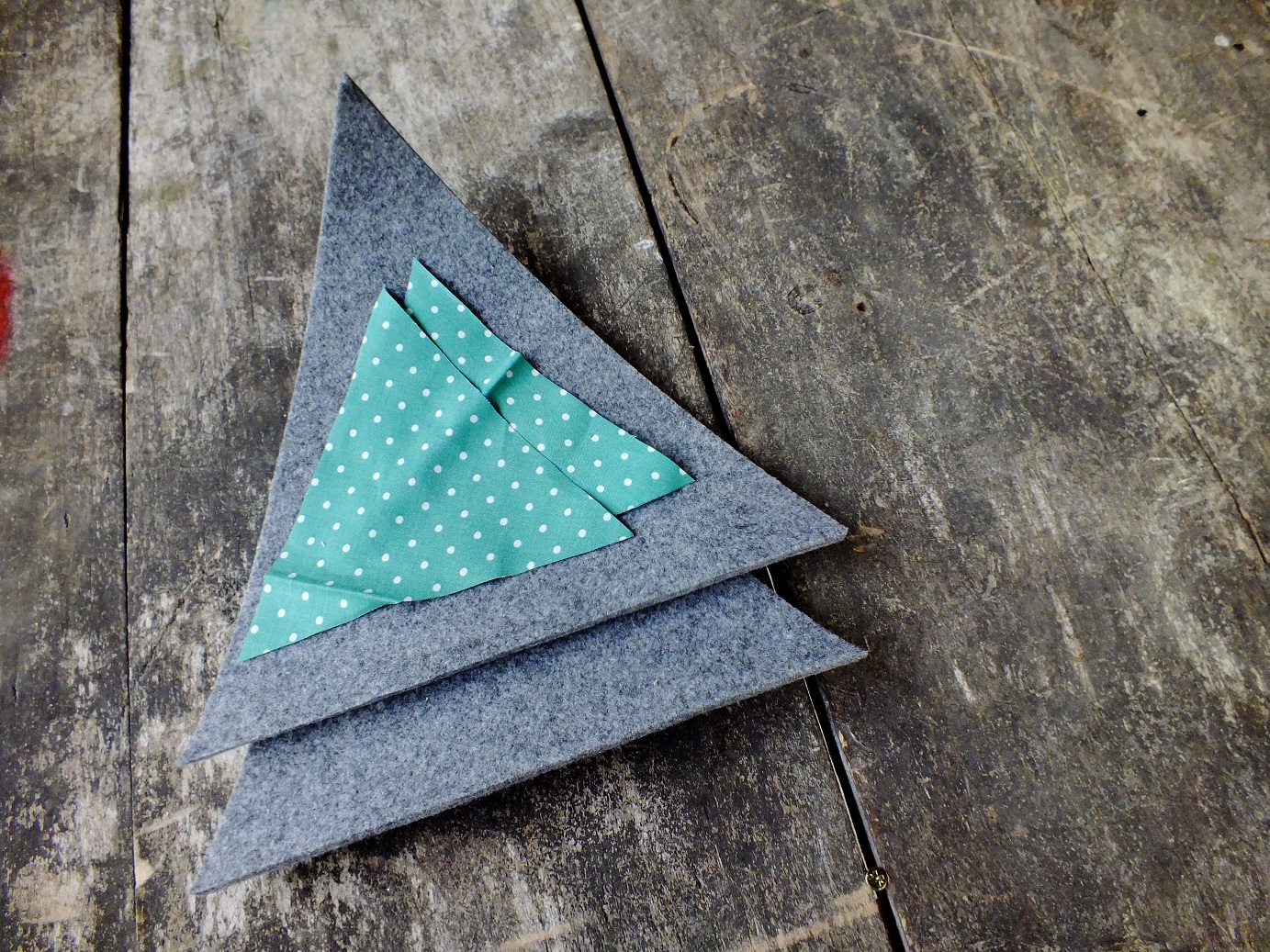Z filcu i z materiału wytnij po dwa trójkąty. Z filcu większe, z materiału mniejsze – na aplikację.