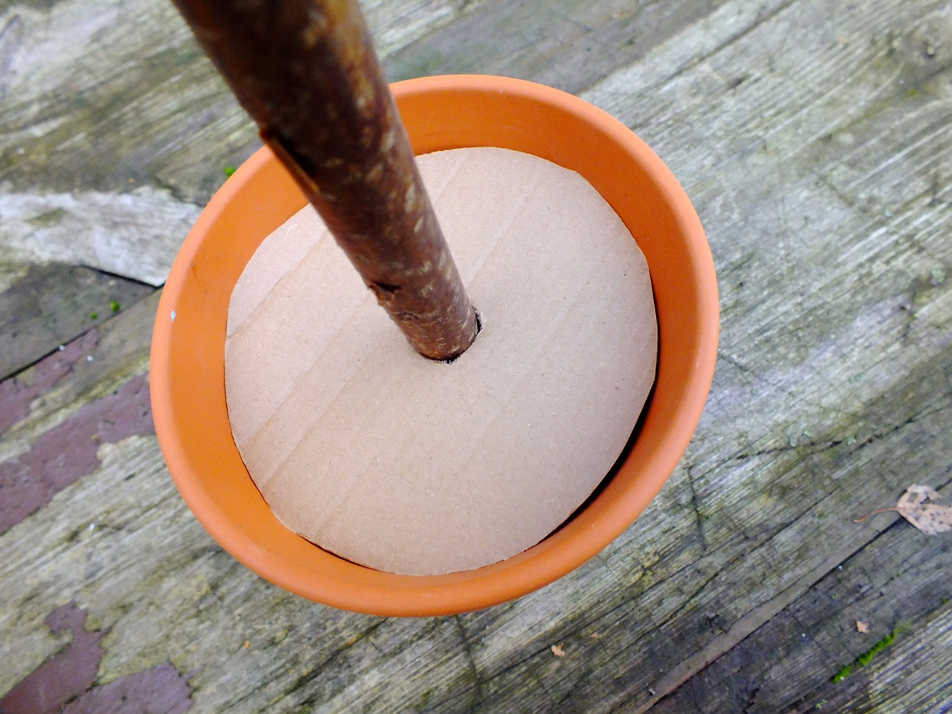 Wytnij kółko z tektury o trochę mniejszej średnicy niż góra doniczki, na środku zrób otwór, uważając aby nie był zbyt duży, gdyż wtedy choinka będzie chwiała się na boki.