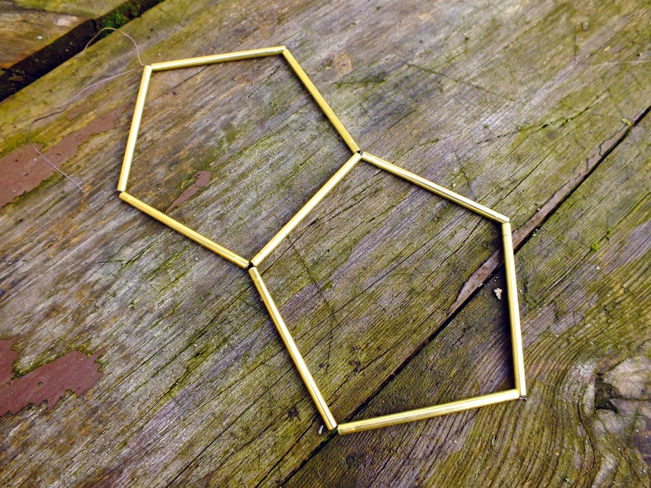 Do jednej rurki boku pięciokąta włóż drucik i nawlecz na jeden koniec 2 rurki, na drugi dwie rurki. Skręć druciki, nadmiar drutu obetnij.