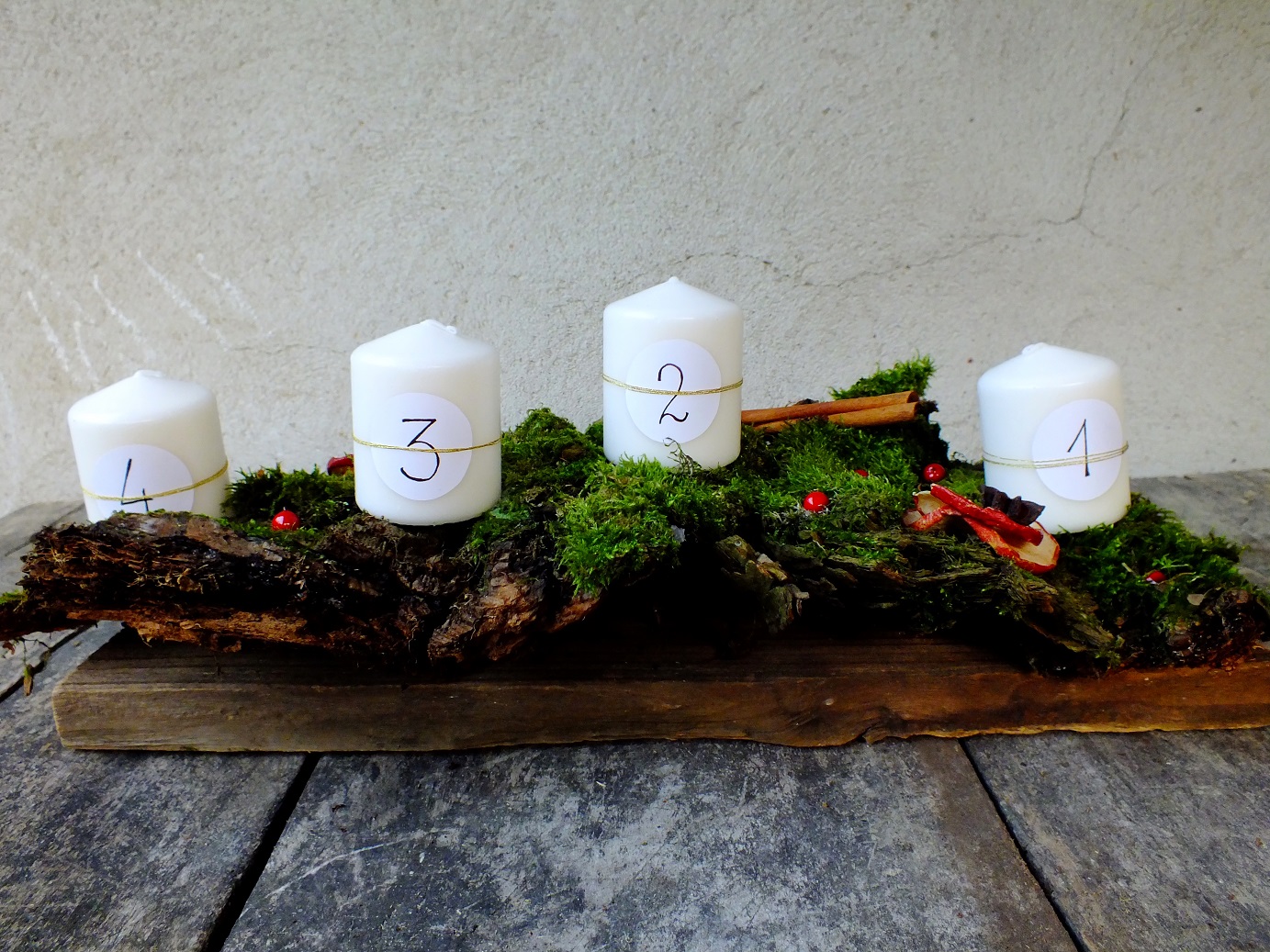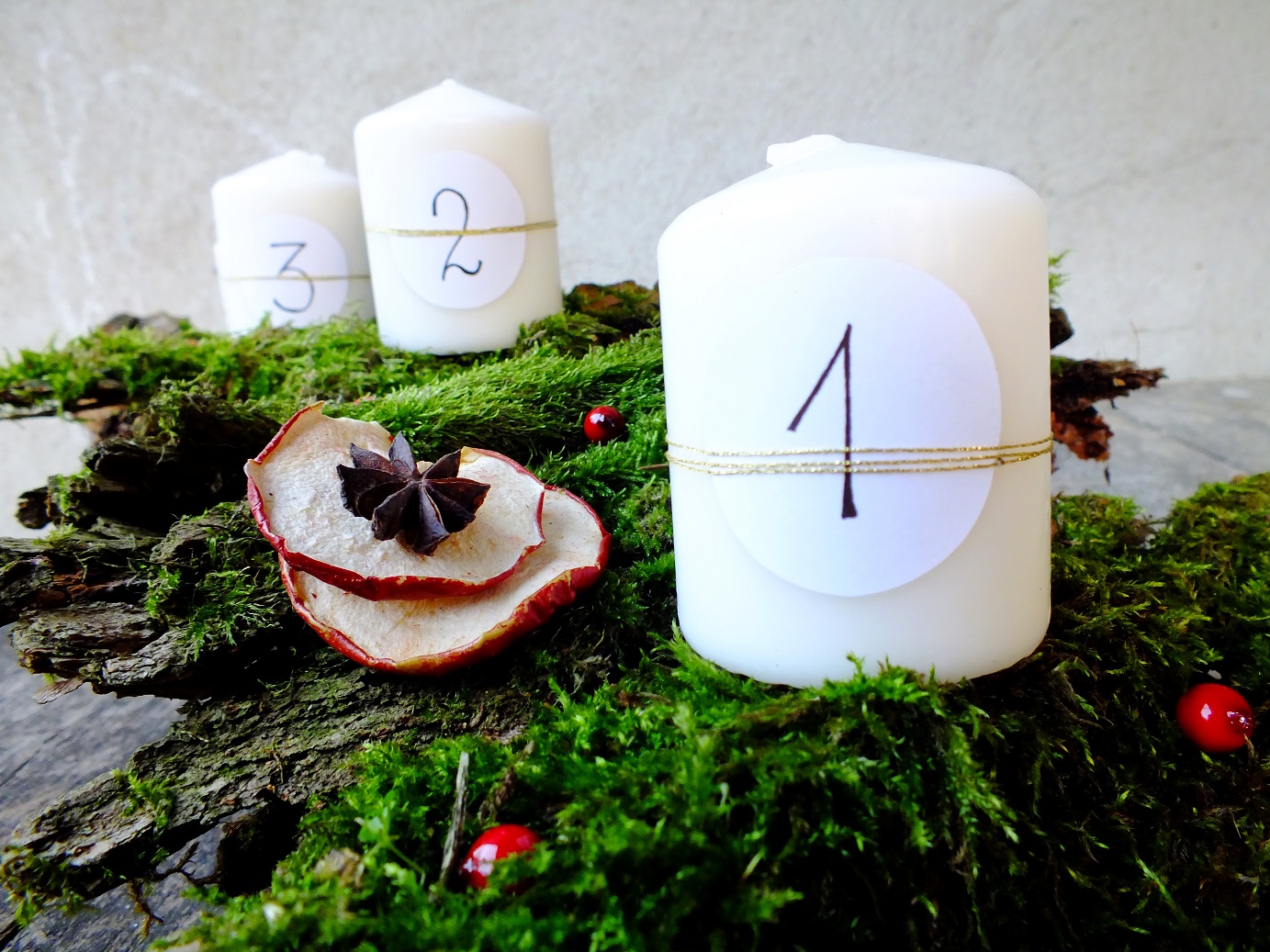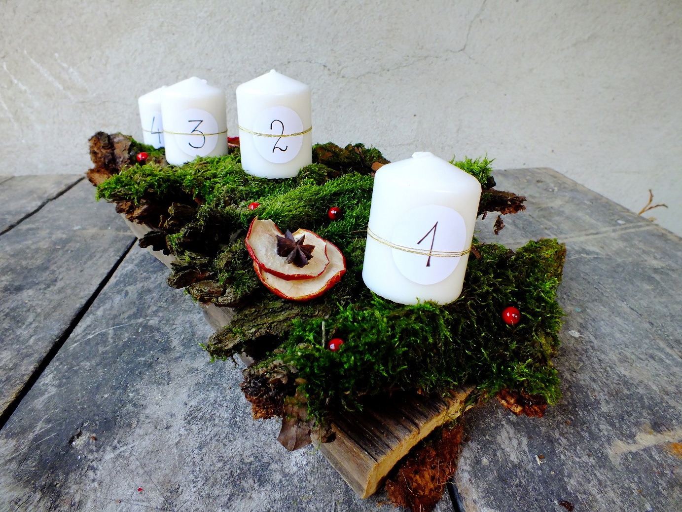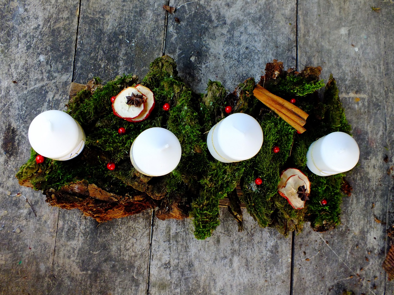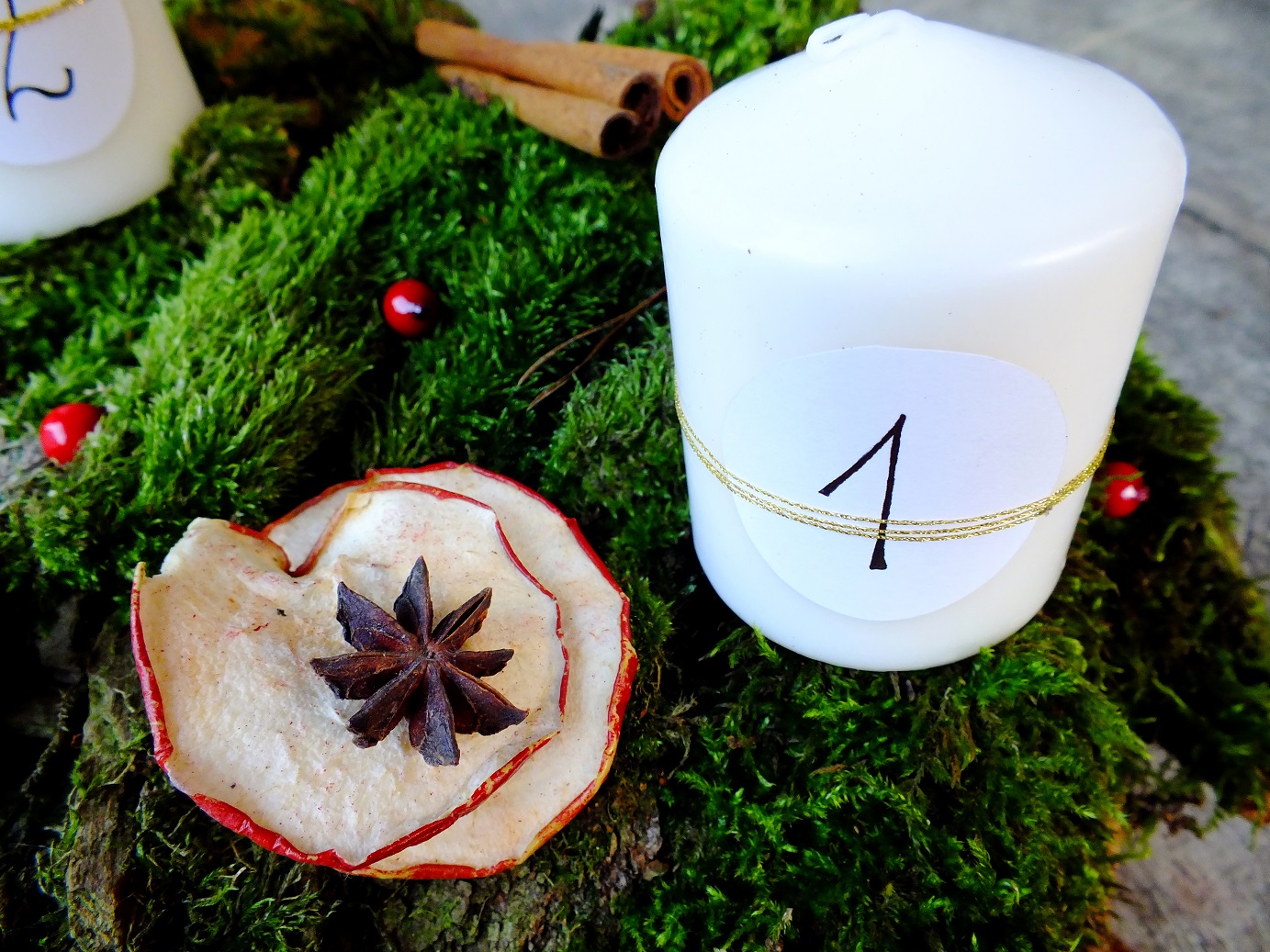 Możesz na mchu poukładać różne ozdoby. W moim przypadku są to czerwone kuleczki, suszone jabłka, anyż i cynamon.