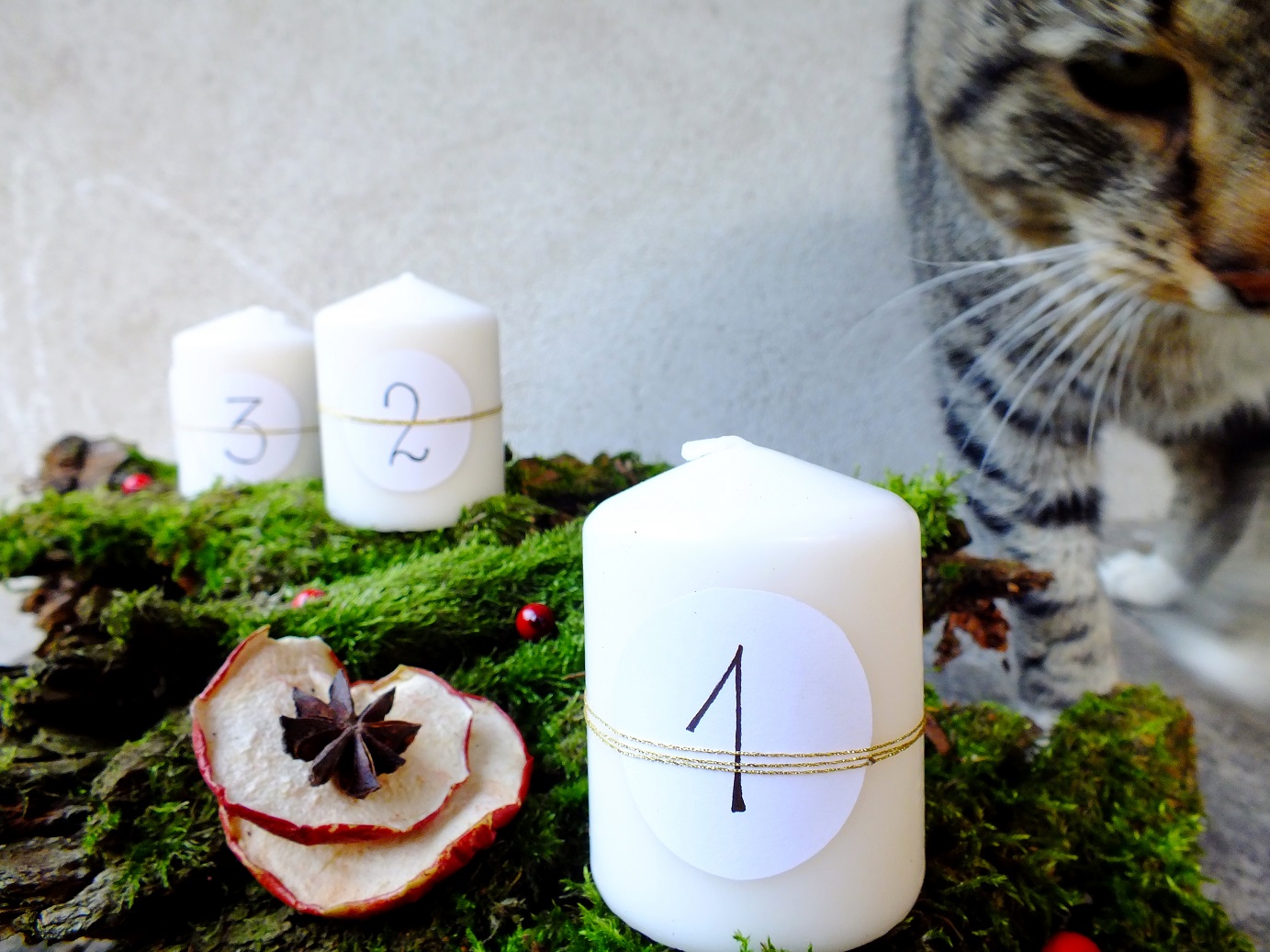 Wieniec adwentowy gości co roku na naszym stole w czasie adwentu. Czasem ma formę typowego wieńca, a czasem przybiera inne kształty, ale niezmiennie ma cztery świece 😉 Już nie mogę się doczekać, kiedy w niedzielę odpalimy pierwszą świeczkę. Lubię ozdoby z naturalnych materiałów… od paru lat w okresie świątecznym używam mchu, suszonych jabłek, cytryn, cynamonu, anyżu. Uwielbiam korzenno-owocowe zapachy wymieszane z zapachem świeżo upieczonego ciasta, blask świec wieczorem, ciepły dom i mróz za oknem… Ech święta… w tym roku jakoś szczególnie nie mogę się ich doczekać, zupełnie jak małe dziecko!