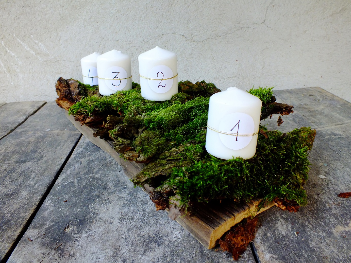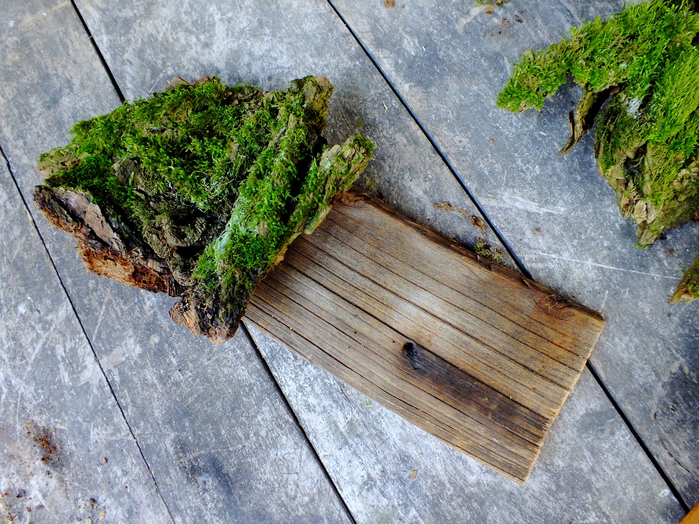 Początkowo na deskę planowałam położyć mech, ale w lesie zobaczyłam piękną korę porośniętą mchem, która odchodziła ze starego pnia, no idealna!