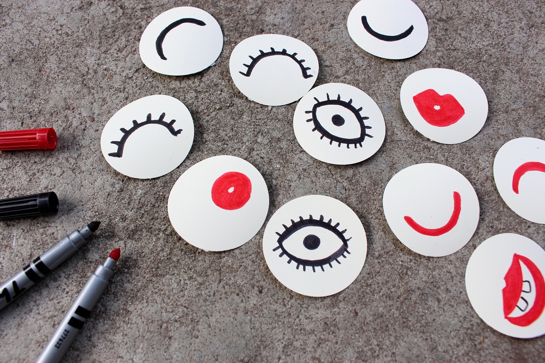 Wytnij małe kółka i narysuj na nich oczy oraz usta w różnych kształtach – wyrażające różne emocje.