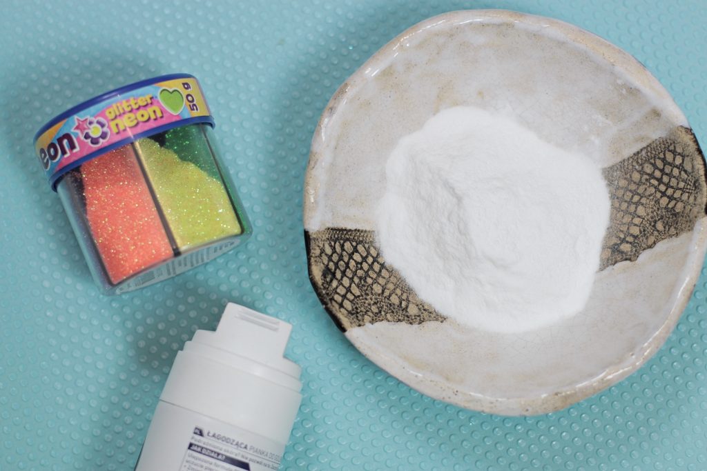 Sodę oczyszczoną pomieszaj z ulubionym kolorem brokatu.