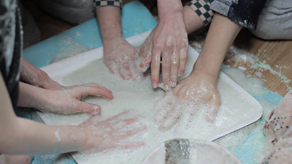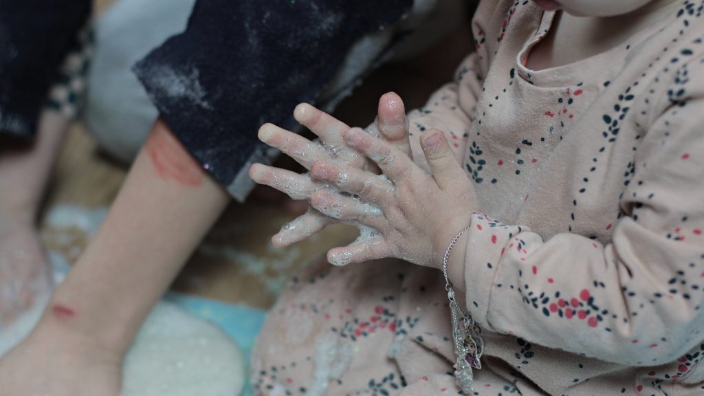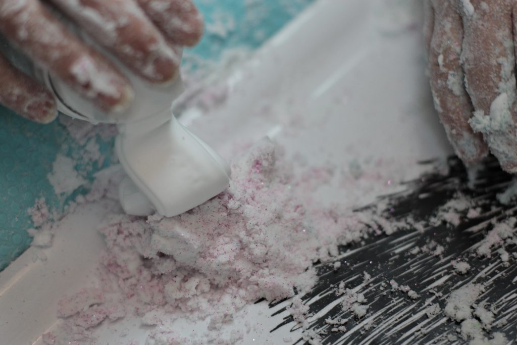 Gdy małe Kredki skończą swe szaleństwa ze sztucznym śniegiem, taką mieszankę możesz wykorzystać do czyszczenia zlewu lub wanny. Jak się okazuje sztuczny śnieg jest doskonałym, ekologicznym środkiem czyszczącym. Aby mieszanka poradziła sobie np. z kamieniem możesz dodać do niej kwasku cytrynowego.