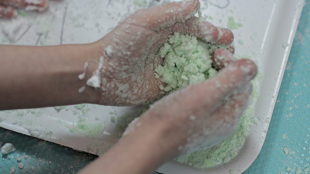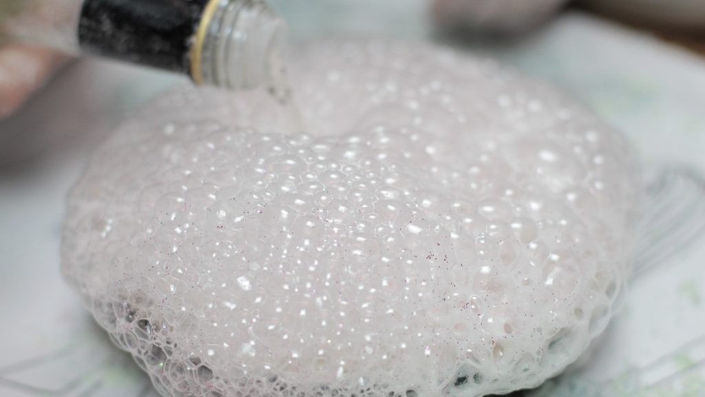 Do mieszanki sody i brokatu dodaj z wyczuciem pianki do golenia.